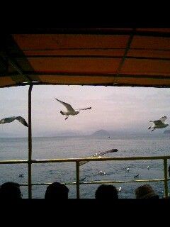 舟屋を見に行く時には、レンタサイクル以外にも遊覧船に乗って周遊していくのですが、そこにはカモメやウミネコの大群が・・・。